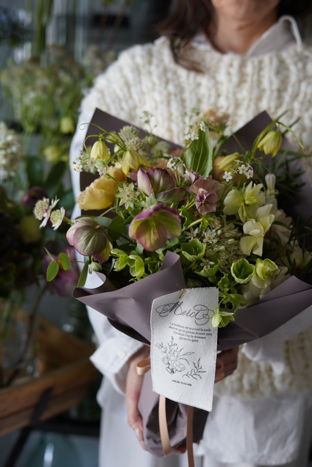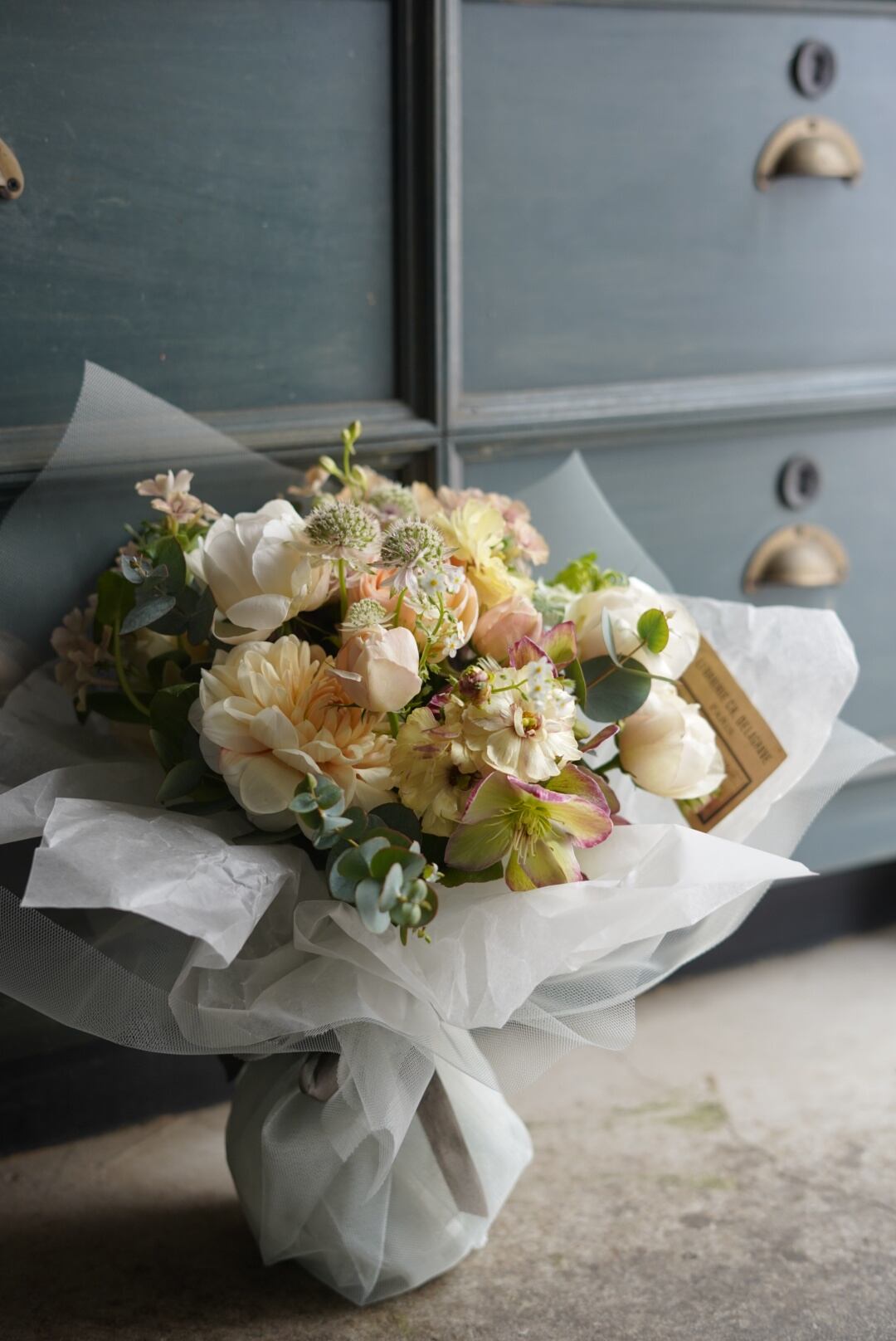 お花はは柔らかなは雰囲気(ホワイト&ベージュ系)に、洗練されたくすみ色を➕して。