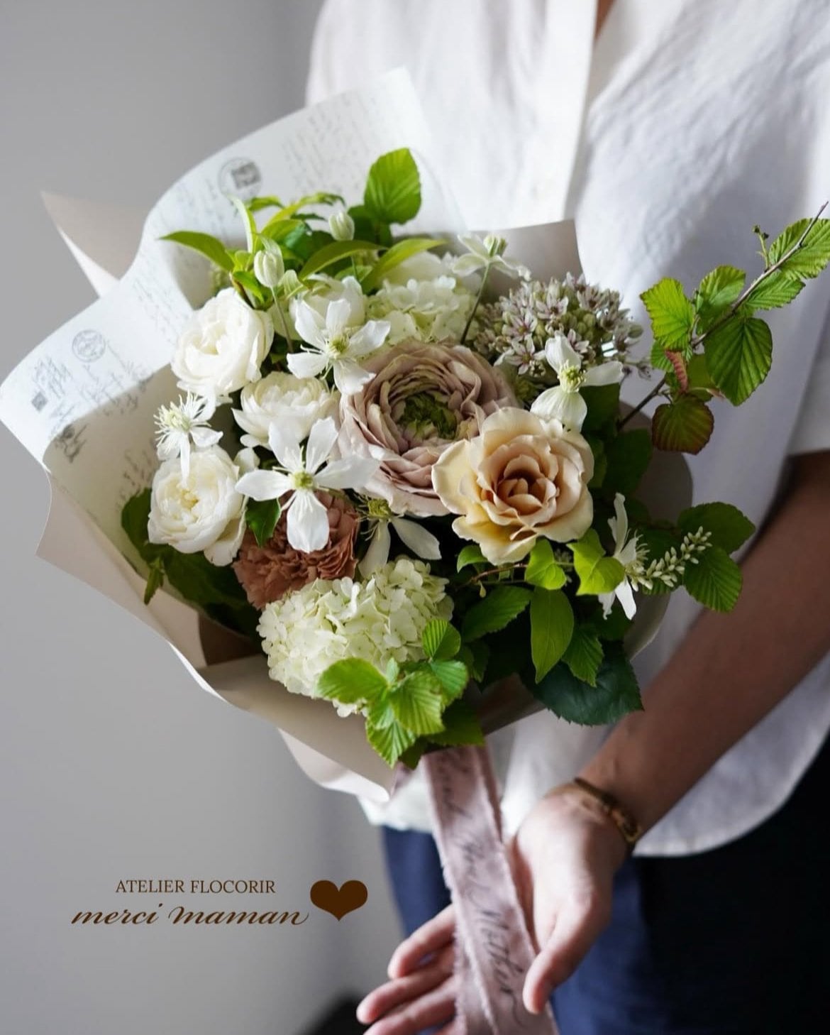 お花は柔らかな雰囲気(ホワイト&ベージュ系)の中に洗練されたくすみ色を+して。